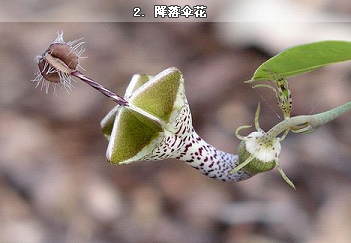 降落傘花學(xué)名為“Ceropegia woodii”。這種奇異植物的花朵呈現(xiàn)降落傘形狀,內(nèi)部的花瓣好象燈絲一樣連接四周,花朵中心就像是一根毛茸茸的棒棒糖從內(nèi)部伸出。整個(gè)花朵收攏起來就會(huì)形成一個(gè)管狀物,邊緣有許多細(xì)小的茸毛向外伸展。當(dāng)有昆蟲被花朵的氣味吸引而來時(shí),就會(huì)被管狀物包裹其中,從而成為降落傘花的營(yíng)養(yǎng)餐。不過,降落傘花從來不吃蒼蠅。當(dāng)蒼蠅飛來時(shí),降落傘花會(huì)將其包裹于花朵中,直到茸毛最終松開,蒼蠅才可得以逃脫。當(dāng)蒼蠅飛走時(shí),它也帶走了降落傘花的花粉。蒼蠅只是它們傳粉的工具而已。
