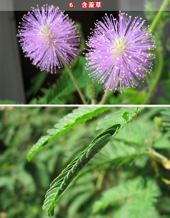 含羞草學(xué)名為“Mimosa pudica”。圖中這種繁星點(diǎn)點(diǎn)狀的粉紅色小花就是含羞草的花,圖下部則是它的葉子。當(dāng)人們用手觸摸它時(shí),甚至只是向它吹口氣,它的葉子就會(huì)收縮起來,似乎受到了驚嚇而做自我保護(hù)。當(dāng)含羞草受到外界干擾時(shí),它們的莖部會(huì)釋放出一種化學(xué)物質(zhì)。這種化學(xué)物質(zhì)會(huì)迫使水份流出細(xì)胞,使得葉子看起來像是萎縮了一樣。對(duì)于含羞草為什么會(huì)進(jìn)化出這種特性,科學(xué)家們至今未能找到明確答案,他們認(rèn)為這可能是用于威嚇捕食者。