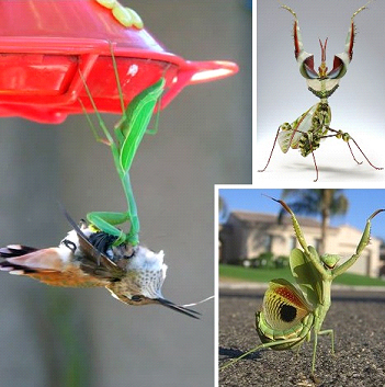 螳螂是可怕的食肉動(dòng)物,它們能吃掉小蜥蜴、青蛙、蛇、蜂鳥,甚至小嚙齒動(dòng)物。在這個(gè)自相殘殺的世界,大型動(dòng)物(鳥和嚙齒類動(dòng)物等)吃掉小型動(dòng)物更普遍,即使最有膽量的螳螂到了緊要關(guān)頭,也需要防御措施?!耙У裟X袋”是人類常干的事,螳螂通常會(huì)通過揮舞前腿、展開翅膀、露出翅膀下面顏色鮮明的斑紋,來威懾對(duì)手。 |