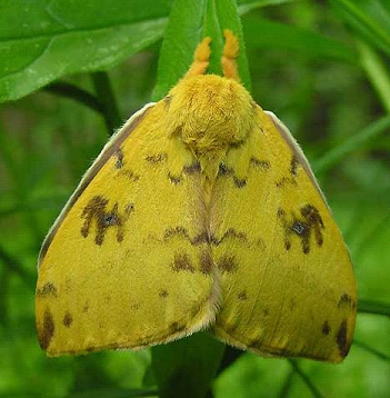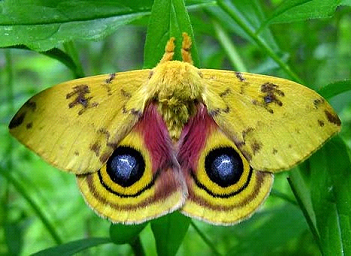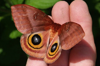 大蠶蛾是一種最鮮艷和驚人的“眼蛾”,它利用振動(dòng)翅膀和可怕的斑紋擾亂和嚇唬潛在的食肉動(dòng)物。靜止不動(dòng)時(shí),大蠶蛾展示的只是前翅的最外層,這一層逐漸從淡黃色變?yōu)槔鹾稚?,很像覆蓋在林地上的雜物。然而,要想讓保護(hù)色產(chǎn)生作用,大蠶蛾必須快速露出翅膀下面的斑紋,每個(gè)翅膀內(nèi)側(cè)都有一個(gè)大大的眼斑。這些斑紋跟眼睛非常相像,它們可能是數(shù)百萬年來進(jìn)化的需要,翅膀上的斑紋最像眼斑的大蠶蛾幸存下來,那些斑紋不像眼睛的蛾子被天敵吃掉了。 |